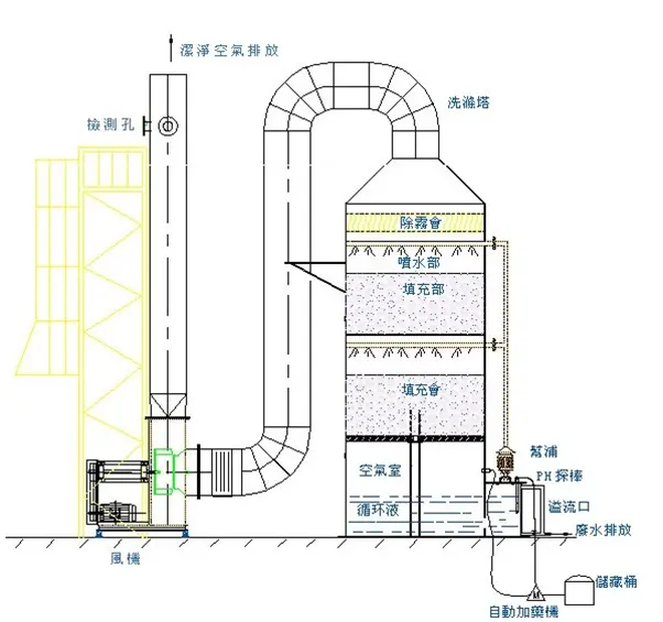 濕式除塵塔工作原理:廢氣由離心通風(fēng)機吸入塔體,經(jīng)由進口的預(yù)噴淋系統(tǒng)除塵降溫,經(jīng)預(yù)處理后的氣體進入填料層,水溶液由泵從循環(huán)水箱提升至塔頂,由螺旋噴嘴噴淋后附著在填料表面,由填料表面形成的液膜完成主要的收集工作,填料較大的比表面積提供氣相及固相間的物質(zhì)傳導(dǎo)。經(jīng)填料層處理后的氣體流經(jīng)除霧段阻隔并收集霧氣后,排入大氣中。煙囪出口粉塵量驗收標(biāo)準(zhǔn)參照《北京市大氣污染綜合排放標(biāo)準(zhǔn)》DB11501-2017。