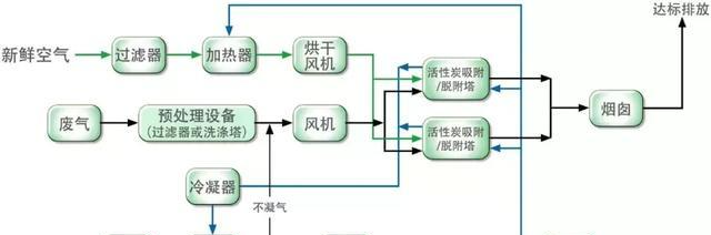 先將有機廢氣用活性炭吸附,當快達到飽和時停止吸附,然后用熱氣流將有機物從活性炭上脫附下來使活性炭再生;脫附下來的有機物已被濃縮(濃度較原來提高幾十倍)并送往催化燃燒室催化燃燒成二氧化碳及水蒸氣排出。當有機廢氣的濃度達到2000PPm以上時,有機廢氣在催化床可維持自燃,不用外加熱。燃燒后的尾氣一部分排入大氣,大部分被送往吸附床,用于活性炭再生。這樣可滿足燃燒和吸附所需的熱能,達到節(jié)能的目的。再生后的可進入下次吸附;在脫附時,凈化操作可用另一個吸附床進行,既適合于連續(xù)操作,也適合于間斷操作。