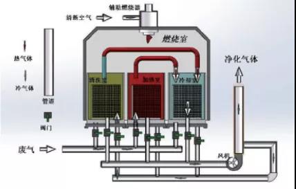 RTO把有機廢氣加熱到760攝氏度以上,使廢氣中的VOCs在氧化分解成二氧化碳和水。氧化產(chǎn)生的高溫氣體流經(jīng)特制的陶瓷蓄熱體,使陶瓷體升溫而蓄熱”,蓄熱用于預熱后續(xù)進入的有機廢氣,從而節(jié)省廢氣升溫的燃料消耗。陶瓷蓄熱體應分成三個(含三個)以上的區(qū)或室,每個蓄熱室依次經(jīng)歷蓄熱-放熱-清掃等程序,周而復始,連續(xù)工作。蓄熱室放熱后應立即引入部分已處理合格的潔凈排氣對該蓄熱室進行清掃(以保證VOC去除率在99%以上),只有待清掃完成后才能進入蓄熱程序。RTO蓄熱式廢氣處理設備,運行費用省,有機廢氣的處理效率高的優(yōu)點,適應廢氣濃度1000~10000mg/m3,分解效率:99%—99.5%。是目前較為經(jīng)濟可靠的達到50mg/m3嚴格的排放標準的VOCs治理技術(shù),得到了廣泛的應用。