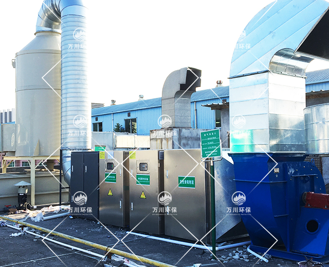 噴漆廢氣主要的成分為有毒的有機氣體和部分粉塵顆粒,首先經(jīng)過通風管道將廢氣輸入噴淋塔內進行清洗除去粉塵顆粒物,進到干濕過濾器進行干燥和過濾剩余的粉塵,干燥后進入UV光解凈化器,利用UV光解凈化器的原理把廢氣分子裂解,生成水和無機物。其次進入活性炭吸附塔,利用活性炭的多孔性存在吸引力,當活性炭與廢氣接觸時活性炭會吸附廢氣分子,最后污染物被處理過后即可排放。