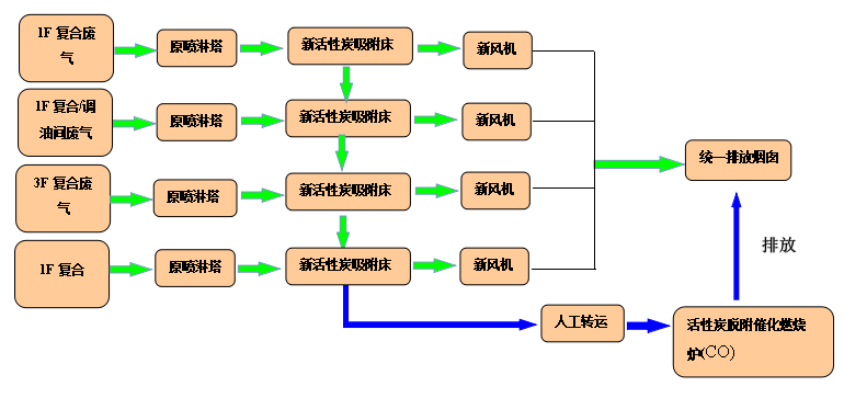 1F和3F的廢氣濃度較低,(根據(jù)檢測報告,部分排氣口濃度接近達(dá)標(biāo)或已達(dá)標(biāo))在保留原有的噴淋塔情況下,各新上一套活性炭吸附塔,處理風(fēng)量為10000m3/h,然后另設(shè)計一套催化燃燒(CO)進(jìn)行離線脫附和再生活性炭。(4套活性炭塔共用一套離線催化燃燒設(shè)備進(jìn)行離線脫附)