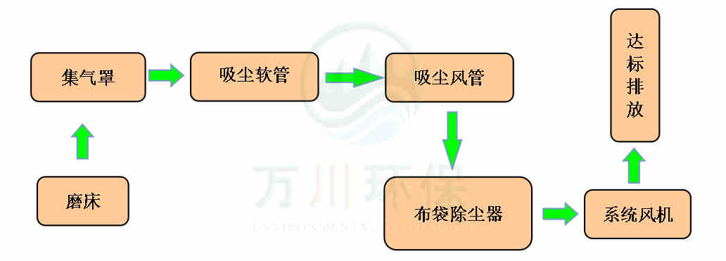 磨床生產(chǎn)時產(chǎn)生的粉塵通過集氣罩、吸塵軟管進入到脈沖布袋除塵器中過濾凈化,粉塵落入灰斗,凈化后的廢氣通過系統(tǒng)風機達標排放。