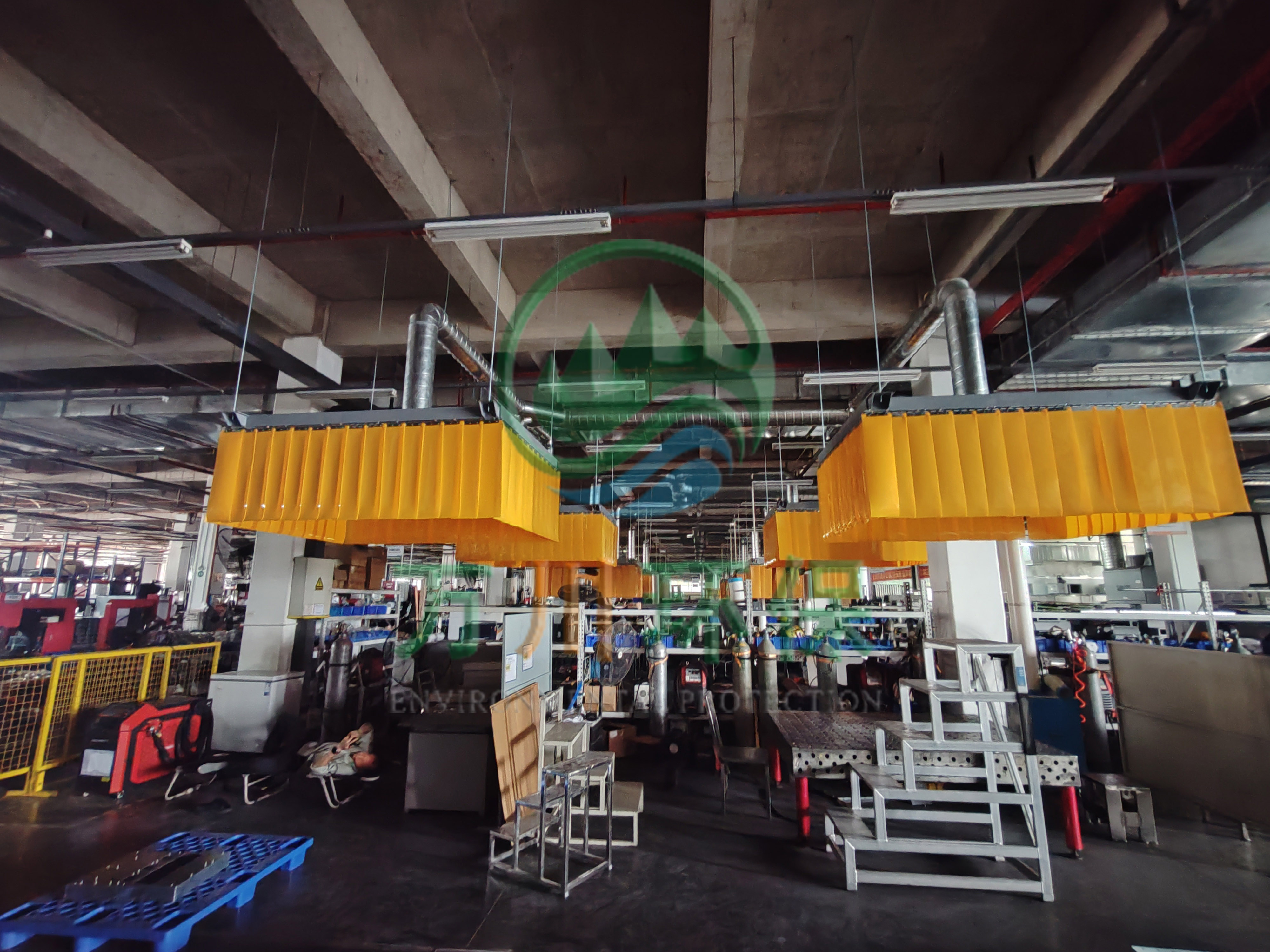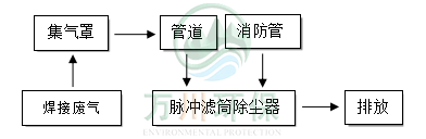 工程師根據(jù)現(xiàn)場焊接煙塵性質、粒徑、現(xiàn)場工況等因素考量,故采用脈沖濾筒除塵器作為處理設備