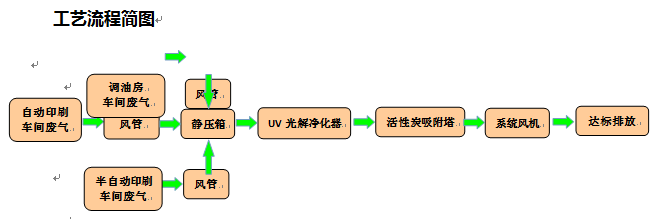 因?yàn)樵撈髽I(yè)印刷機(jī)車(chē)間均為密閉車(chē)間,且已做排風(fēng)系統(tǒng),但排風(fēng)系統(tǒng)和小風(fēng)機(jī)均為直排到高空和廠房1樓外部,影響到了周?chē)h(huán)境。經(jīng)過(guò)我司工程師現(xiàn)場(chǎng)勘查,結(jié)合企業(yè)的實(shí)際生產(chǎn)情況,我們最終決定采用UV光解法+活性炭吸附法來(lái)進(jìn)行處理。