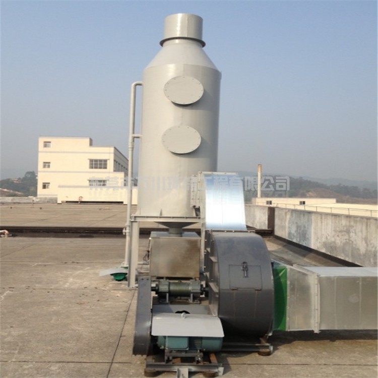 含塵廢氣在風(fēng)機(jī)的作用下,含塵氣體從塔體下方進(jìn)氣口沿切向進(jìn)入濕式除塵器噴淋塔,在風(fēng)機(jī)的作用下,迅速充滿進(jìn)氣段空間,然后塔頂位置的噴淋頭向下噴水,水與含塵廢氣接觸,使得空氣和粉塵分離,達(dá)到除塵的效果。濕式除塵器噴淋塔具有結(jié)構(gòu)簡單、造價低、占地面積小、凈化效率高等優(yōu)點(diǎn),能夠處理高溫、高濕的氣流,將著火、爆炸的可能減至最低。