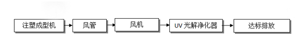 該公司在生產過程中有注塑成型工序,該工序產生了一定量非甲烷總烴有機廢氣。根據廠房提供的資料,我們工程師在參考了廣東省地方標準《大氣污染物排放標準》(DB44/27-2001),中華人民共和國《大氣污染物綜合排放標準》(GB16297-1996)后,根據以往工程經驗,為該企業(yè)選擇了UV光解為主體處理工藝。